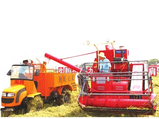 双峰县井字镇,农机在稻田里收割。 李建新 摄