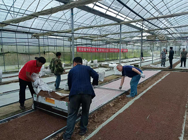 在道二育秧大棚工作现场,村民们正熟练地使用自动化覆土机将底土、盘根无纺布、育秧纸、基质一次性铺设到位。