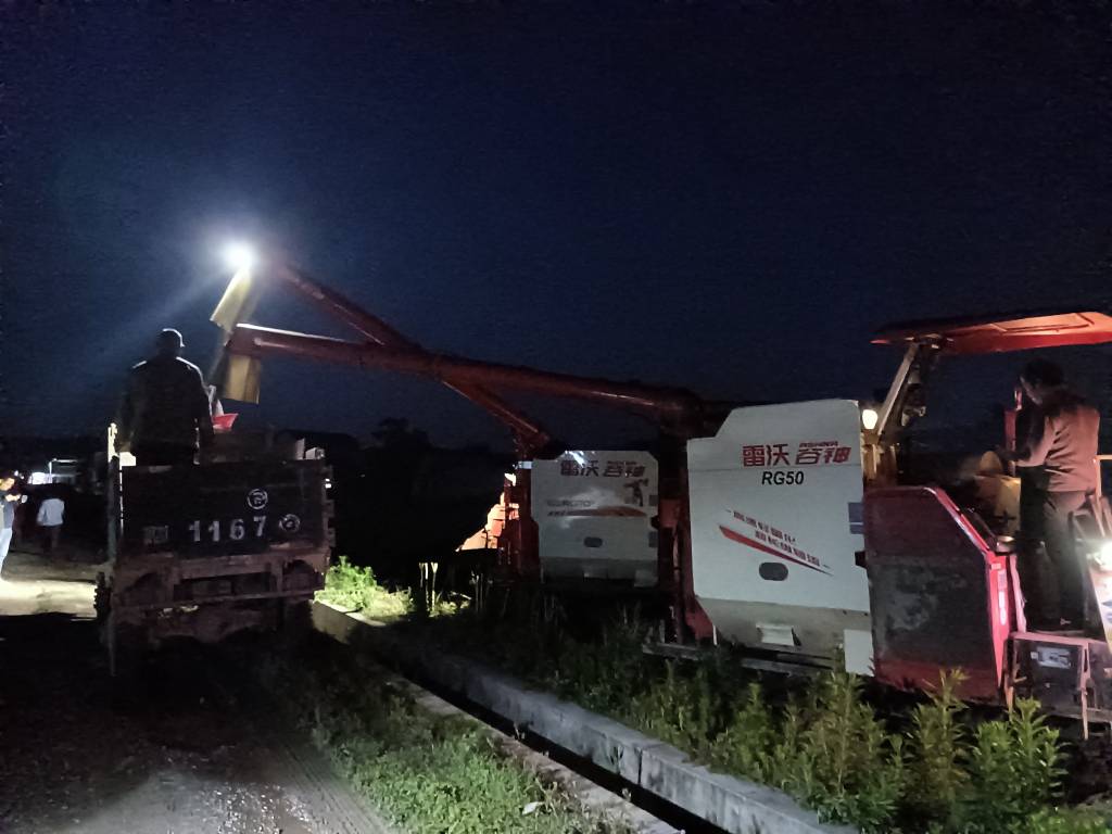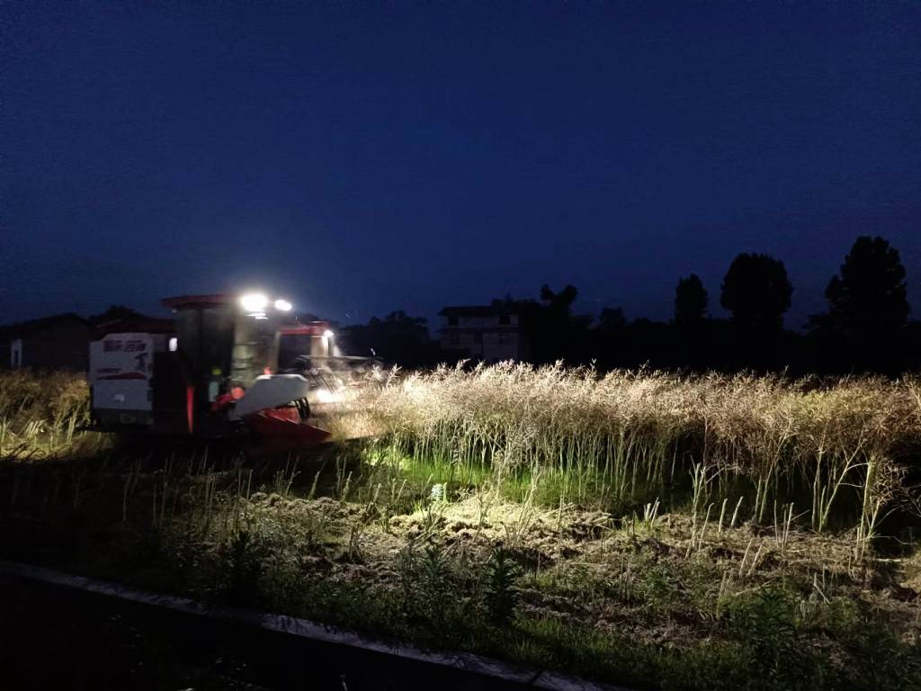 夜幕降临,郭金波一行人来到报木洞村千鑫农业合作社,两台收割机在油菜地里不间断作业,晚上8点半200多亩油菜已全部抢收完。