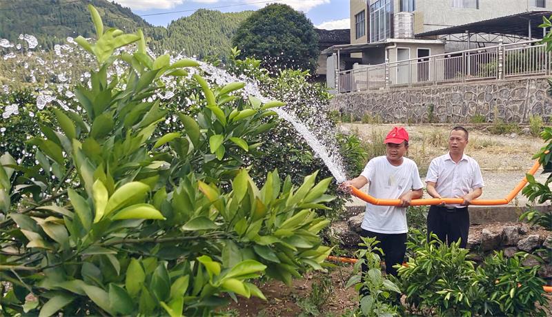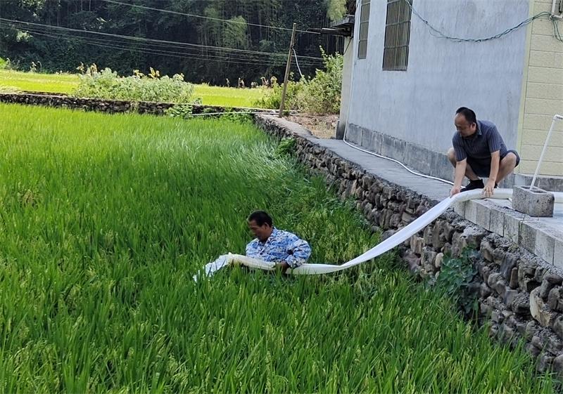 2022年8月17日,湖南省湘西土家族苗族自治州保靖县复兴镇大妥村村民彭延安站在开裂的稻田里,手捧喷着甘泉的水管充满欣喜的说:“感谢农机干部将救急的农机抗旱抽水机送到田间地头,为我们带来了抗灾的及时雨!”。