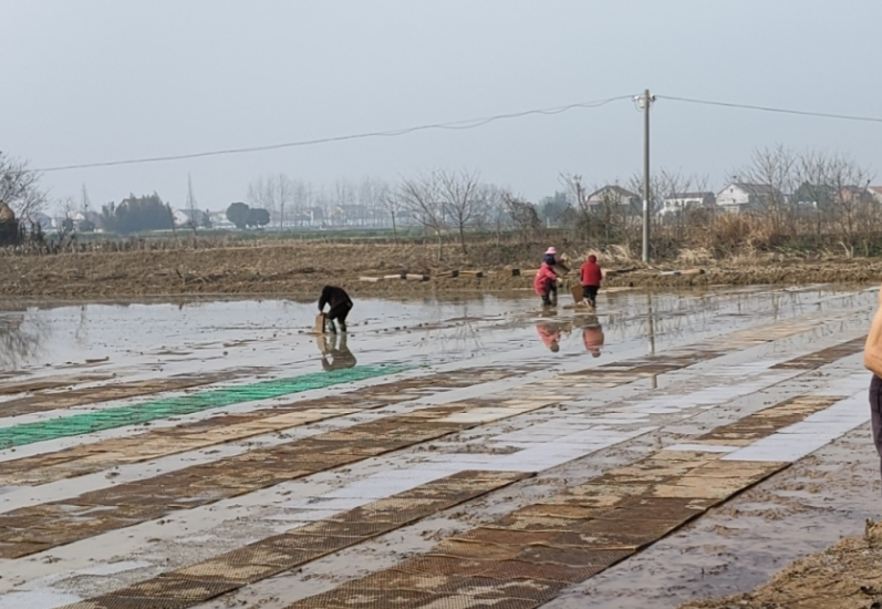 2月27日,湖南常德澧阳平原乍暖还寒,澧县丰锡农机化服务专业合作社的几名社员穿着雨靴在田间忙碌着摆放秧盘,该社负责人曹波说,今年计划早稻集中育秧6000亩,比往年多了上1000亩,早点动手,便于3月中旬及时播种。
