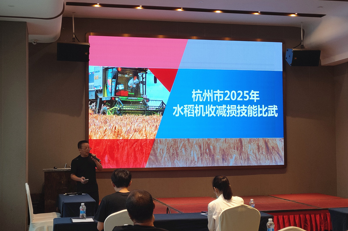 比武环节中,参赛选手驾驶着一台台联合收割机穿梭于田间,在确保收割作业效率同时,精准控制割台高度与行进速度。裁判组依据《杭州市2025年水稻机收减损技能比武规程》,采取观察操作过程和实测时间、损失率等方式,对作业速度、作业质量、减损情况等指标进行现场评判。整个过程还邀请到农业技术专家和第三方监督人员进行现场监督,以确保比赛结果公平性和公正性。