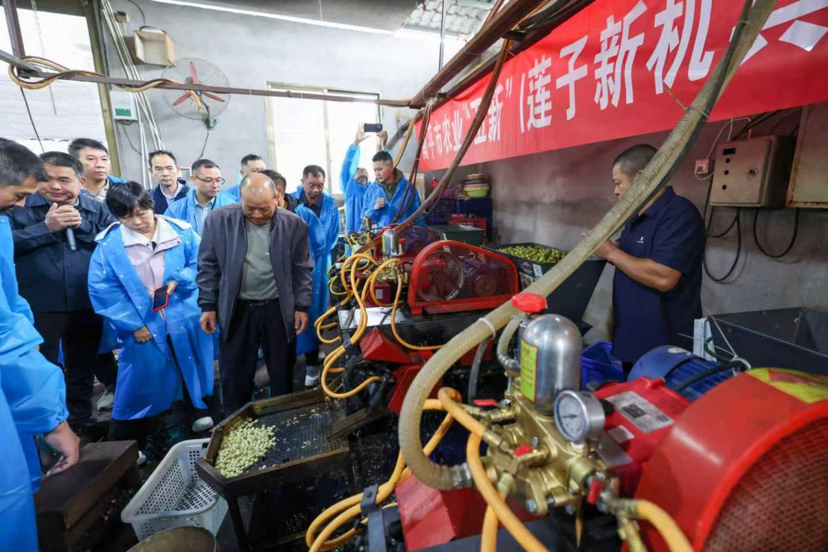 活动首站设于武夷山市五夫镇武夷山喊山特产农民专业合作社,莲子机械化生产全链条演示成为焦点。白莲脱壳一体机、二次去皮机、籽莲通芯机依次运转,将以往依赖人工的繁琐工序实现机械化处理,整套流程效率较人工提升10倍以上,大幅降低劳动成本。