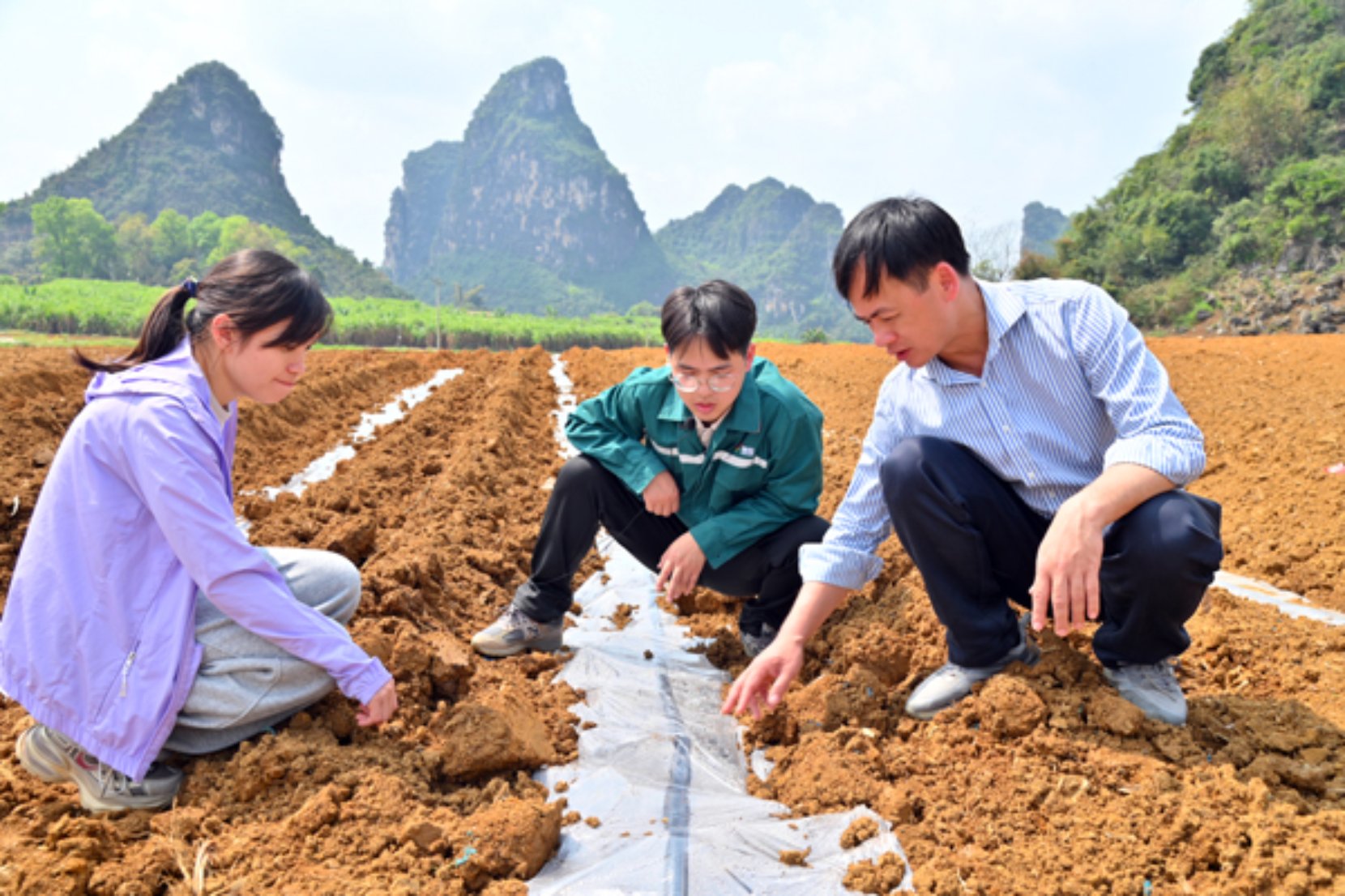 大新县农业农村局工作人员在查看甘蔗水肥一体化设施。雷丽军摄