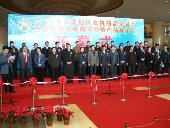 3月12日,长春锦江花园大酒店门前广场,彩旗飘扬,人声鼎沸,一排排崭新的农机具摆放整齐,“2007年东北地区农机商品交易会暨吉林省农机购置补贴产品展示会”正在这里召开。 省人大副主任张恩祥宣布展示会开幕。省农委副主任陈巳在开幕上致辞。省政协副主席孙耀庭、省政府副秘书长冯巍、省农委副主任任克军、省农委纪检专员孟繁芝出席开幕式。国内外130余家农机企业参加本次展会,展示的机具500余台(件)。会议期间还将举办商务洽谈等活动。 2007年,我省农机总动力将新增200万千瓦,新增水稻插秧机2500台,水稻联合收割机500台,玉米收获机械400台,农田基本建设机械500台,50马力以上大型拖拉机5000台,深松机和深耕犁各500台。这次展示会的召开,可以更好地宣传国家和吉林省的农机补贴政策,展示农机新产品,推进全省农机化事业的发展。