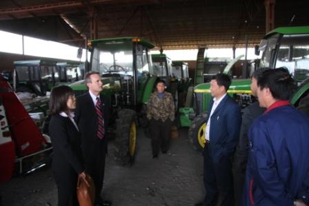 在长春的一天之行,道格拉斯先生先访问了其代理商吉林省金桥农机有限责任公司,并在公司董事长刘波先生及各业务经理的陪同下,视察了公司的库房、库存储备及配件维修中心,并在公司会议室与扶余农机协会会长于庆和及其终端用户农民兄弟亲切交谈,听取迪尔产品质量和性能等方面的意见。北美人的坦诚、迪尔人的诚信、用户的朴实、金桥农机人的热情构成了会议和谐一家亲的气氛。道格拉斯先生表示一定继续努力,将更加优质、适用的高端产品不断地提供给中国农民。